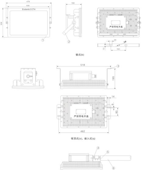 安裝方式:吸頂式(x)、壁式30°(b1)、壁式90°(b2)、吊桿式(g)、護欄式(h)、法蘭式(f)